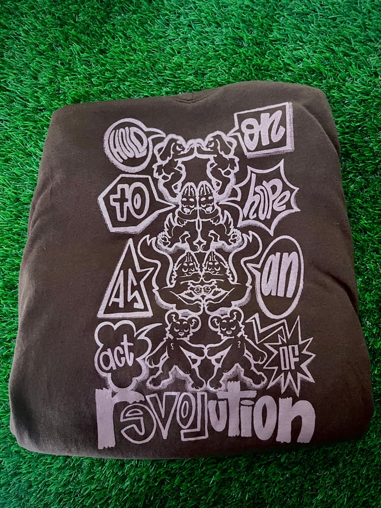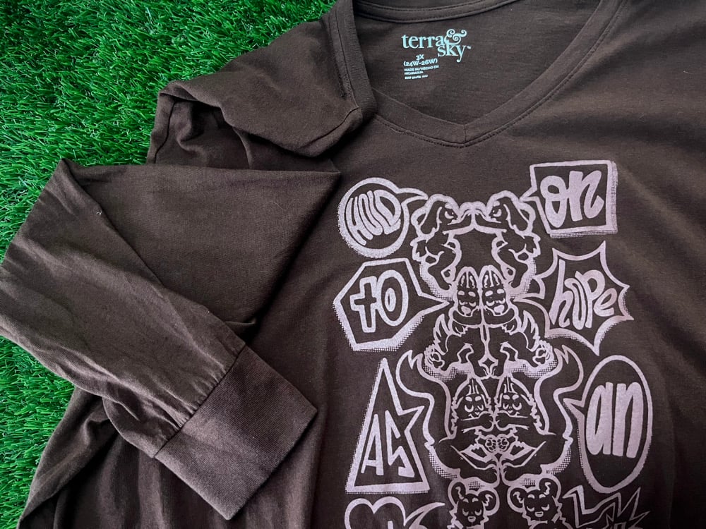 This is a size 3XL long sleeve v neck shirt from Terra & Sky. It has the design “Hold on to Hope as an Act of Revolution” on the front, and on the back bottom has a small “Love”.
