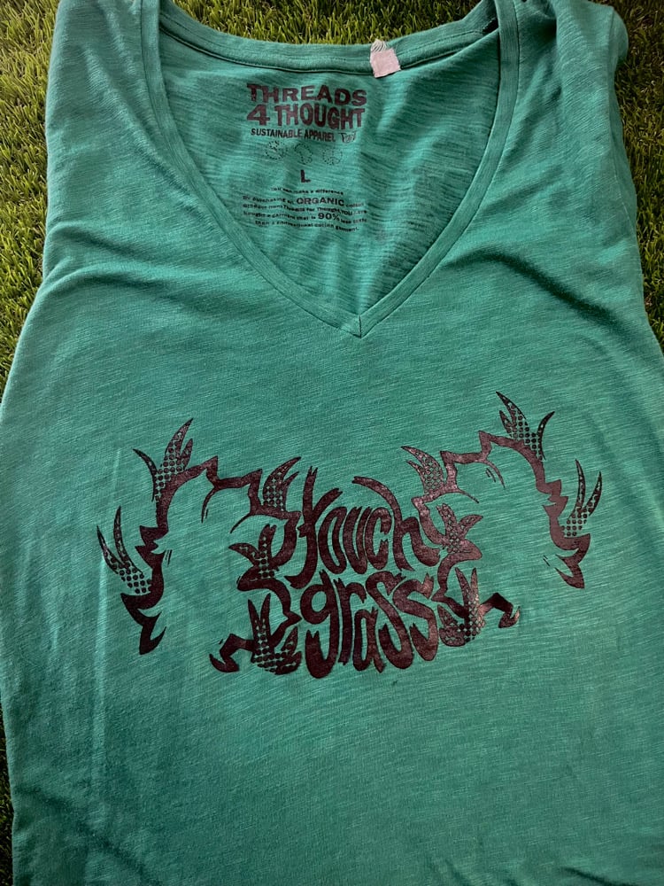 This is a size large v neck shirt from Threads for Thought. It has the design “Touch Grass” on the front, and on the back features two paws.